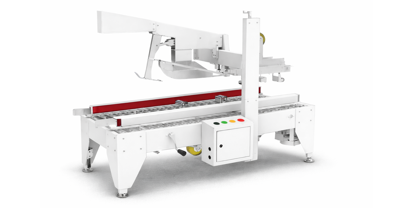 Closes the top flaps of a filled corrugated case and applies tape across the seam in a single automated pass.
